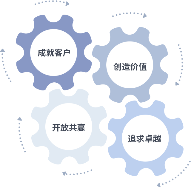 成就客户是一切决策的出发点,,,,创造价值是衡量所有工作的标准,,追求卓越是我们做事做人的态度,,开放共赢是我们的格局也是最终的结果。。价值观的齿轮环环相扣,,,,推动着组织里的每个人不断向前。。。。